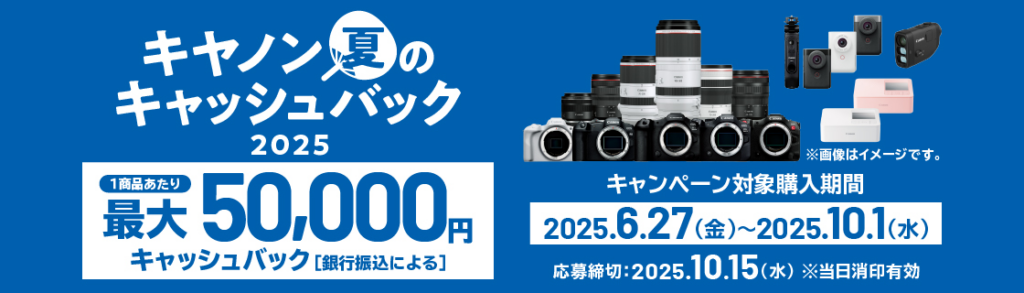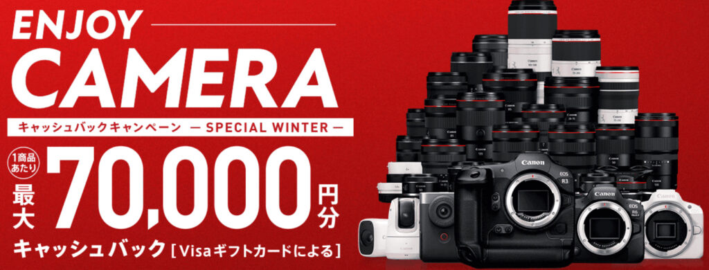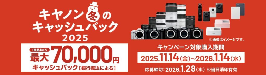 Canon公式オンラインショップの2025年3回目となるキャッシュバックキャンペーンが2025年11月14日から2026年1月14日まで開催中です!